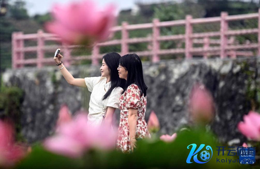 6月4日,在广西三江侗族自治县良口乡和里村,旅客在盛放的荷花旁拍照眷恋。