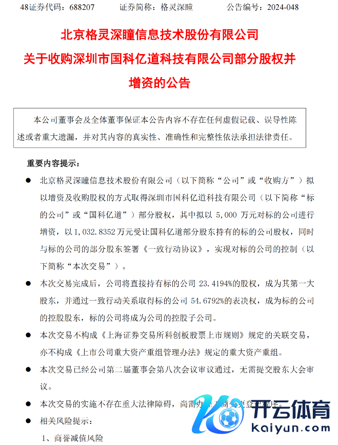 值得一提的是,11月26日格灵深瞳同期发布公告称,拟以增资及收购股权的时势获取深圳市国科亿说念科技有限公司(以下简称“国科亿说念”)部分股权,其中拟以5000万元对“国科亿说念”进行增资,以1032.8352万元受让国科亿说念部分激动抓有的“国科亿说念”股权,同期与“国科亿说念”的部分激动签署《一致步履条约》,终了对“国科亿说念”的阻挡。该次往复完成后,格灵深瞳将径直抓有标的公司23.4194%股权,成为其第一大激动,并通过一致步履关系获取格灵深瞳54.6792%的表决权,成为格灵深瞳的控股激动。