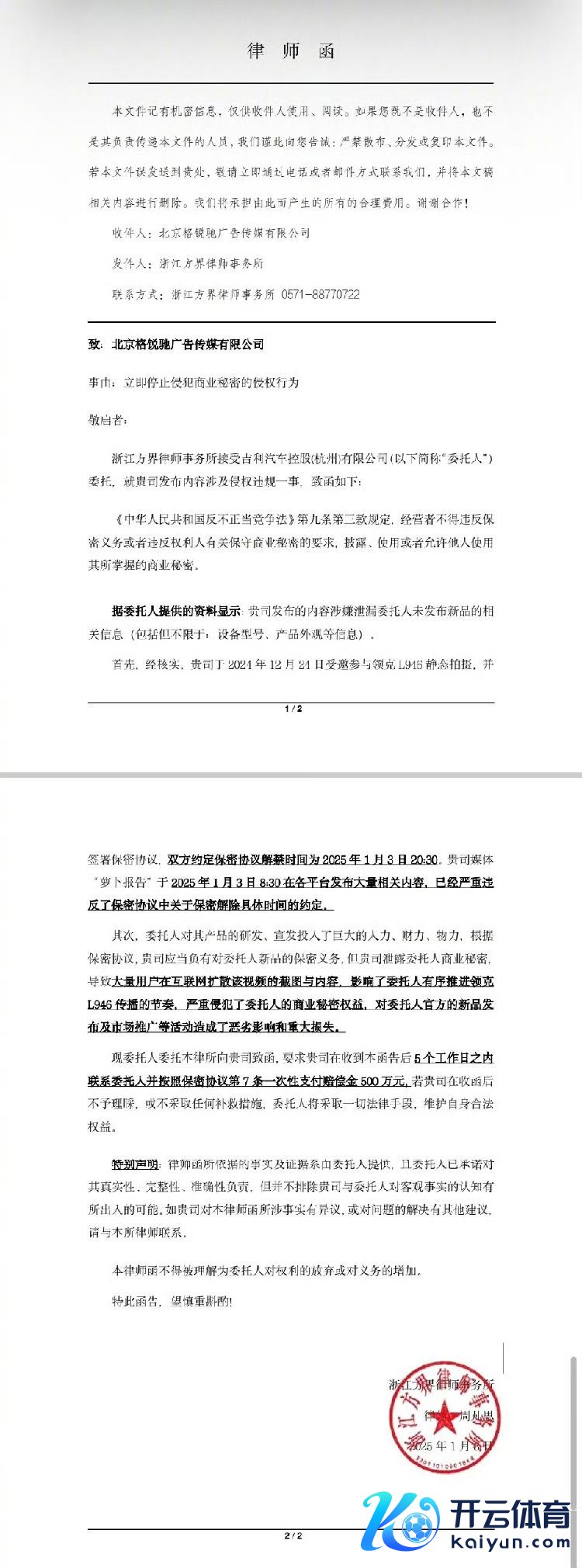 在泄密事件发生后不久,领克方面果决领受了法律时期,向涉事博主发出了讼师函。讼师函中明确指出现金九游体育app平台,博主方违犯了此前签署的守密左券,这种毁约四肢对领克新车的阛阓实践策略产生了极为负面的影响。讼师函骄横,条目公司在收到讼师函告后5个职责日之内有关托福东谈主并按照守密左券第7条一次性支付补偿金500万元。
