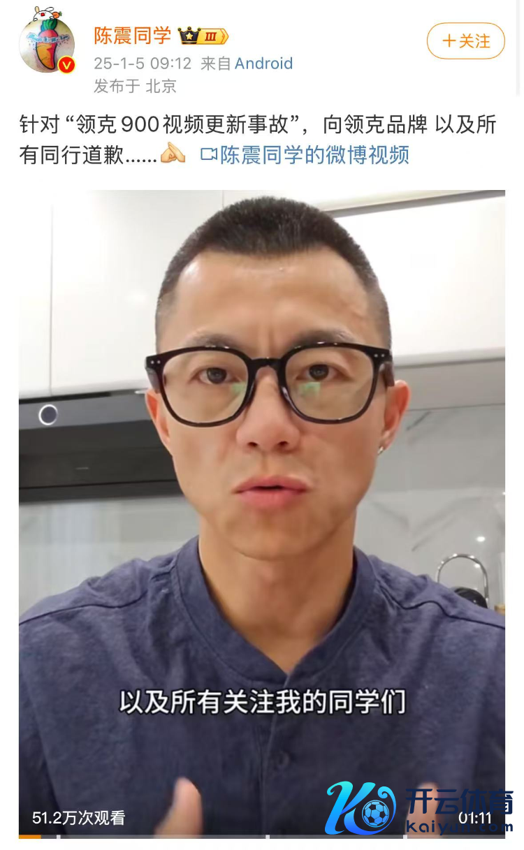 1月5日,知名汽车博主陈震发文称,针对“领克900视频更新事故”,向领克品牌以及通盘同业谈歉。