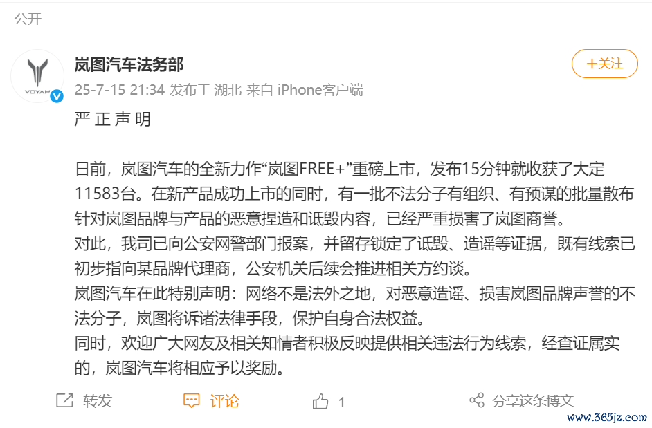 岚图汽车法务部:已就坏心责备行径报案,既有印迹已初步指向某品牌代理商岚图汽车法务部:已就坏心责备行径报案,既有印迹已初步指向某品牌代理商