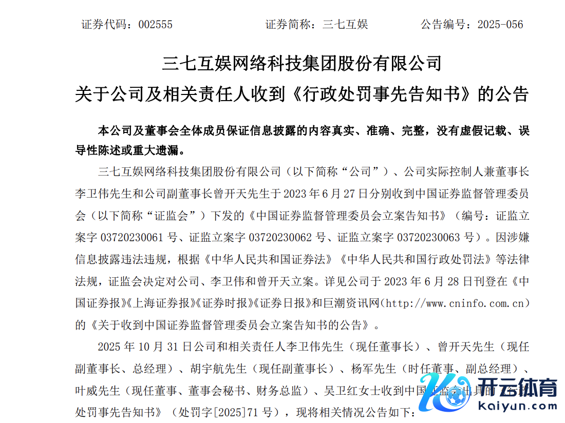 这一处置源于2023年6月,那时三七互娱公告收到证监会下发的立案见告书,因涉嫌信息败露非法违纪,证监会决定对公司、公司本色戒指东说念主兼董事长李卫伟和公司副董事长曾开天立案。